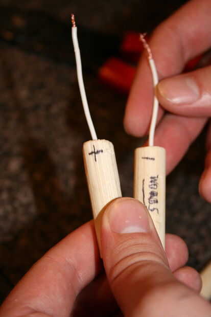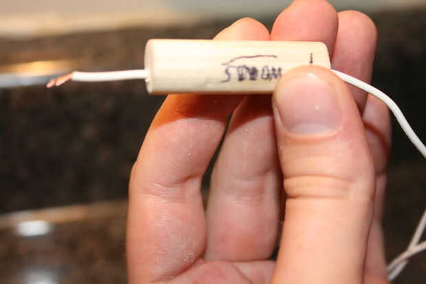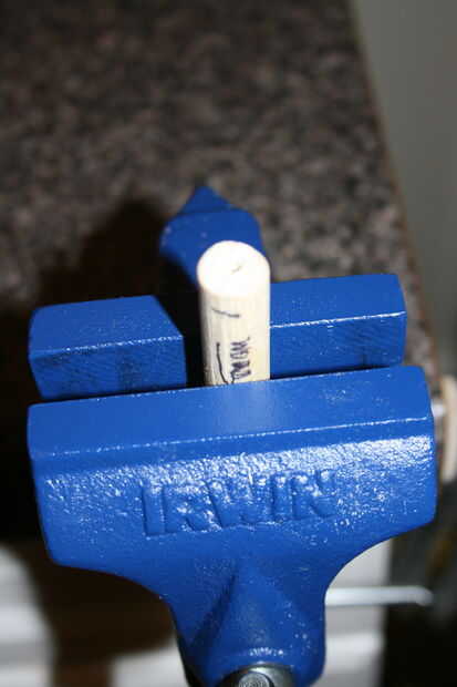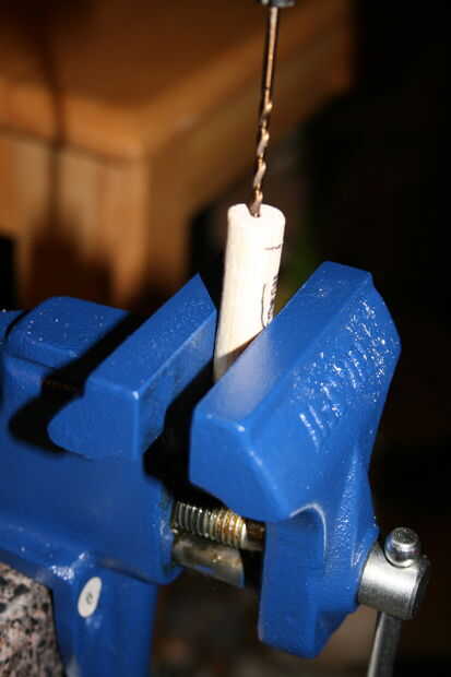 Vamos a utilizar un tornillo por cada batería para actuar como los contactos. Coloque uno de los tacos cortos en la vice y perfore un agujero completamente vertical, a través (véase el cuadro). 5/8 de pulgada debería ser suficiente, pero tiene cierto margen de maniobra. Los agujeros deben ser lo suficientemente grande como para alimentar el alambre a través, pero no mucho más grande. Queremos como un agujero guía para el tornillo, lo que usted necesita para bloquear en la madera firmemente más adelante. Cuando termines, adelante y alimentar a uno de los cables a través de uno de los tacos, luego hacer lo mismo con la espiga y el alambre restante.