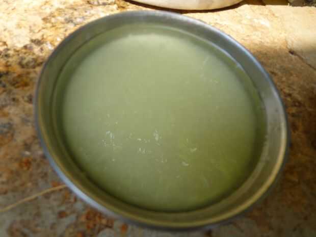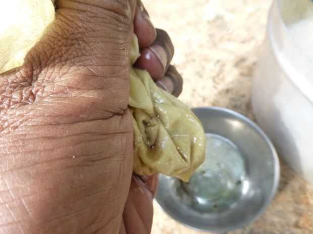 • Exprimir el aceite de la tela en otro recipiente o en una cáscara de coco vacía
