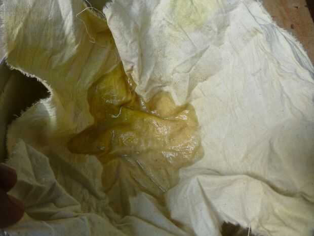 • Cuando la mezcla se enfría lo suficiente, puede separar el aceite de la mezcla. Puede utilizar un pedazo pequeño de tela, el tamaño de un pañuelo de mano para esto.