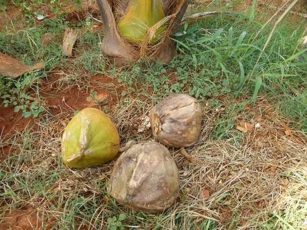 Busca alrededor y recoger los pocos cocos caídos. También necesita par de rocas, uno puede ser una gran roca en el suelo y el otro puede ser menor en tamaño que puede levantar fácilmente.