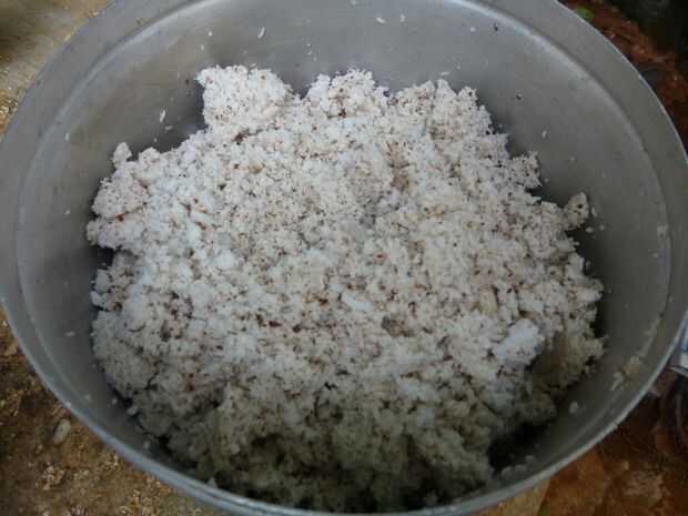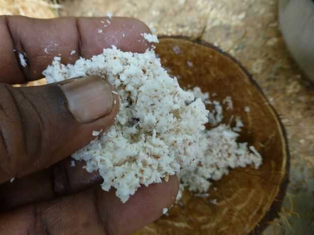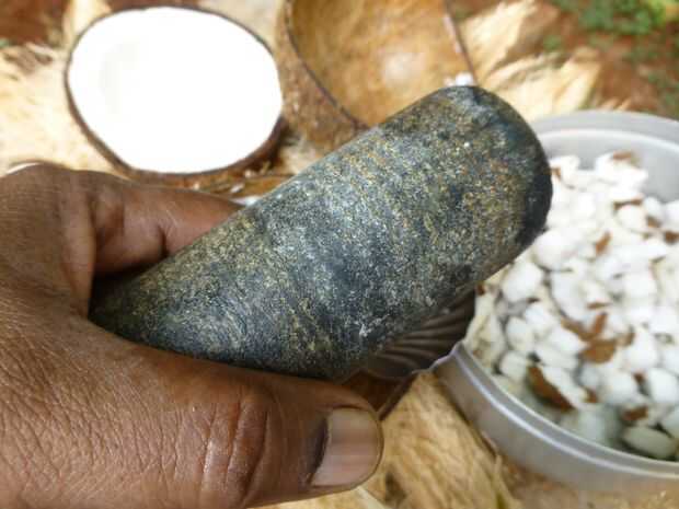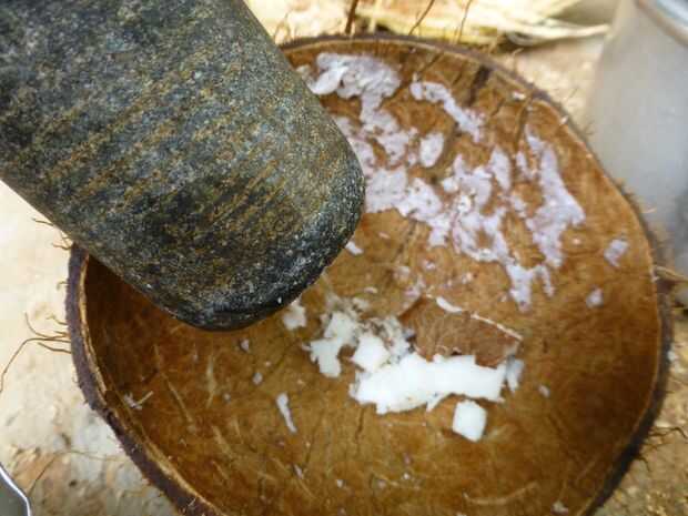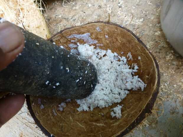 Busque una piedra desgastada como esta en la foto aquí a lo largo de la orilla. Vamos a utilizar esta piedra para rallar la carne de coco. Puede hacerlo en una cáscara de coco vacía, en un casco, sobre una roca o incluso en un caparazón de tortuga bien limpio. Colocar los trozos de carne de coco en el recipiente y libra con la piedra para rayarlos.