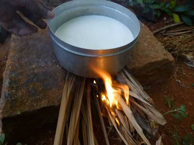 • Mantenga el utensilio lleno de leche sobre el fuego. También puede utilizar una concha de tortuga para hervir la mezcla.