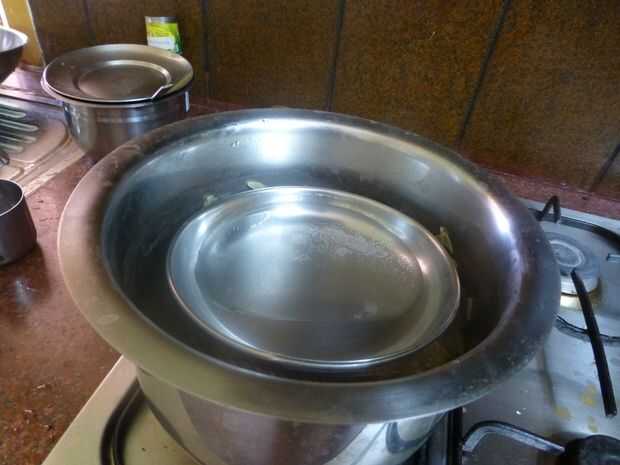 Los vapores de agua junto con el aceite de rosa se consigue refrescados una vez que están en contacto con el fondo de la sartén y las gotas de agua de forma. Este gotitas caerán dentro del vaso y serán recogida en la bandeja. No hervir demasiado, de lo contrario tienes mucha agua en la placa.