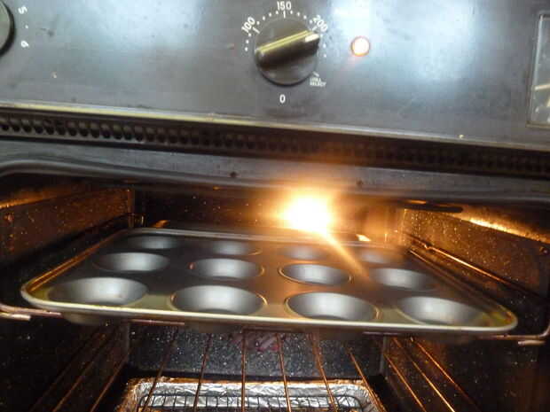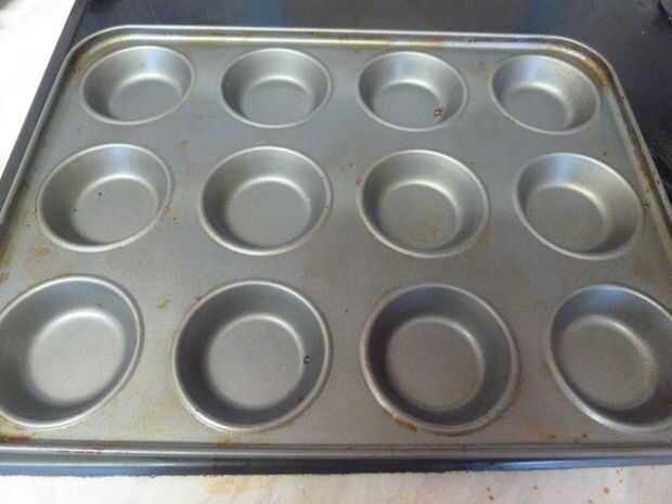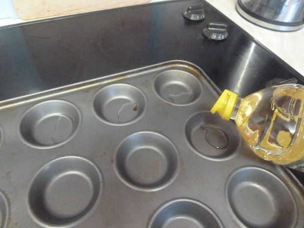 Luego coge su bandeja de Magdalena 12 hoyo y vierta un poco de aceite de girasol en cada orificio (suficiente para cubrir la parte inferior).