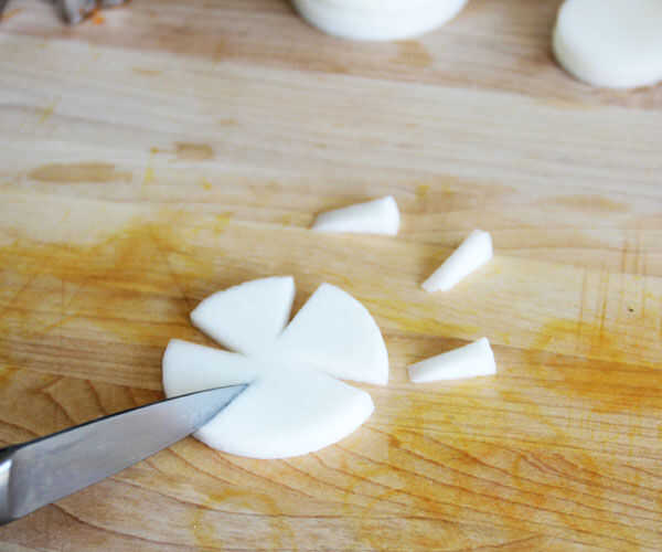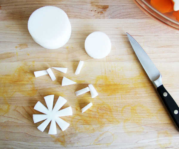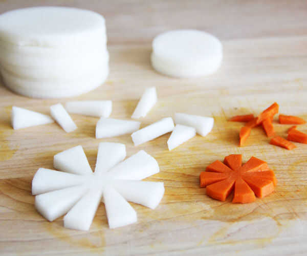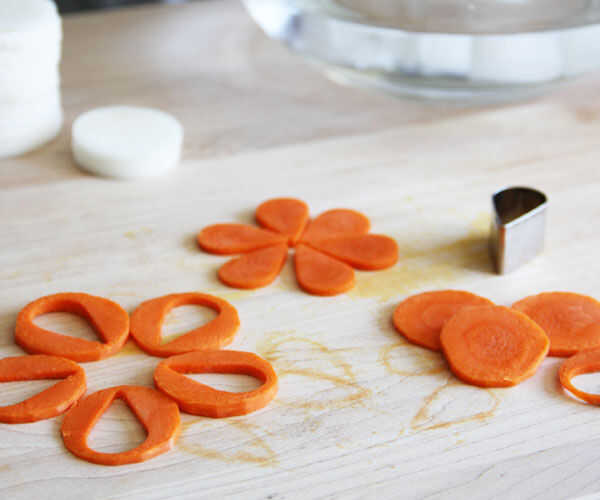 También asegúrese de cortar unos círculos pequeños, cuadrados y triángulos en ambos vegetales para utilizar como centros de flor
