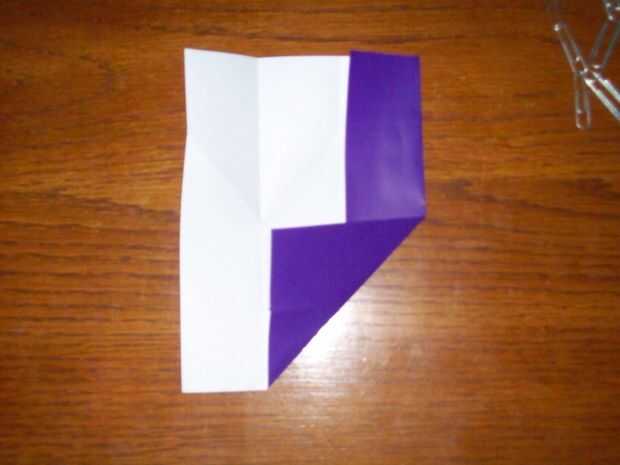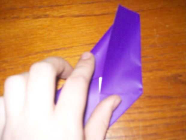 Gire el papel 180 grados y repetir el paso 2. Entonces, en lugar de desplegar, meta el doble triángulo hecho en el último paso en la cavidad formada por la aleta derecha, como se muestra en la imagen.