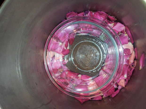 En su cacerola colocar el ladrillo en el centro y su tazón de fuente de pyrex en la parte superior. Ahora coloque los pétalos de rosa alrededor del ladrillo, debe alcanzar sobre la parte superior. Vierta suficiente agua para cubrir sus pétalos, que deben estar apenas sobre el ladrillo.