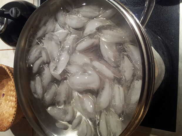 Coloque la tapa de la olla boca abajo y comenzó a hervir hasta que llegue a hervir; una vez que baje el calor al punto bajo. cuando comience a hervir otra vez lugar mucho hielo en la tapa.