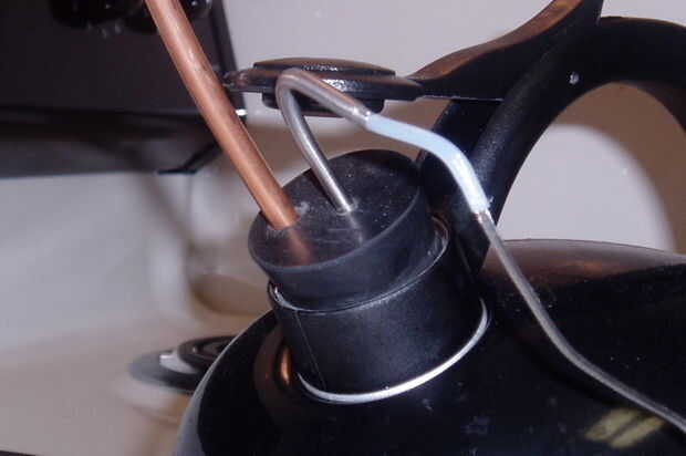 el tapón se ajusta en la boquilla de la tetera a la de la foto. el tubo debe estar fuera el líquido para capturar los vapores y la sonda del termómetro debe estar inmerso en el agua, pero no tocar el fondo o las paredes de la caldera. el hervidor se consigue más caliente que el líquido y sesgar los resultados. sólo desea que la temperatura del líquido.