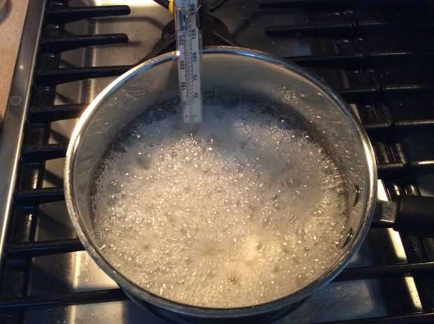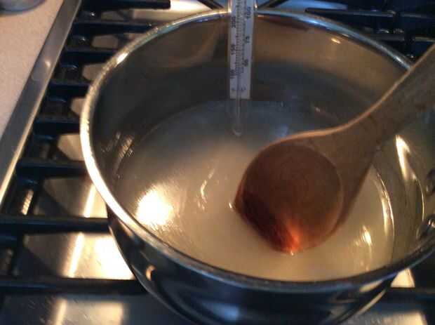 Todos los ingredientes por encima Vierta en la olla está utilizando y cocine sobre fuego medio alto con su termómetro de caramelo también en la olla. Mantenga revolviendo lentamente la mezcla hasta que comience a hervir luego se detiene. Déjalo sentarse allí hasta que llegue a 320 grados F. Después de que alcance esa temperatura, y en su tazón microondas o envase y añadir colorante alimentario y flavoring(optional).
