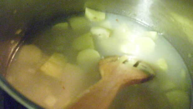 Aumente el calor para obtener el líquido hirviendo. El almidón de las patatas es lo espesará esto lo que necesitas salir de los puntales. Que este fuego lento durante 20 minutos, hasta que la patata esté tierna. Trate de no sobre cocinar porque mordedura un poco añade textura a este.