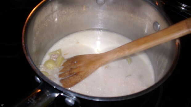 El tocino se levantará a la tapa. No se trata de una emulsión verdadera, pero si desea darle un wisk, teniendo cuidado de no romper las patatas. Gusto otra vez por la salinidad, si es demasiado salada para añadir de nuevo sobre una cuchara de crema de leche y sabor.