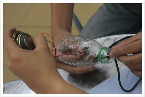 • Retire la tapa de la botella. Desconecte los cables de uno de los altavoces con las tijeras.