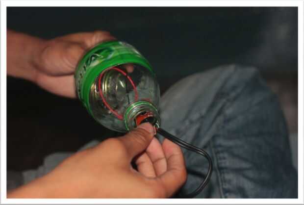 • Inserte los cables del otro altavoz a través del cuello de la botella y con cuidado tire de ellos de la boca, con la parte delantera del altavoz hacia la parte inferior abierta de la parte superior la mitad de la botella.