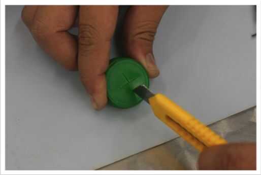 • Utilizando la herramienta de corte, corte a través del centro de los casquillos de la botella con una línea horizontal y otra una vertical, formando un signo "+". Lentamente tire hacia afuera las cuatro aletas que se formaron por los cortes. Introduzca los cables a través de las tapas y gire este último en los cuellos de las botellas.