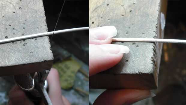 Mida dos veces! Utilizar un pin de banco para mi corte. Colocar el cable en el pin, alineando mi marca con apenas más allá del borde del perno. Recordando que la hoja de sierra retirar material cuando corta para tener que cortar no directamente en la marca sharpee pero solo un smidge más allá de ella, de lo contrario mi anillo quedará demasiado pequeña. Para esta parte siempre quieren acabar de cortar un poco de todos modos mucho tiempo así que puedo volver y para justo a la longitud perfecta.