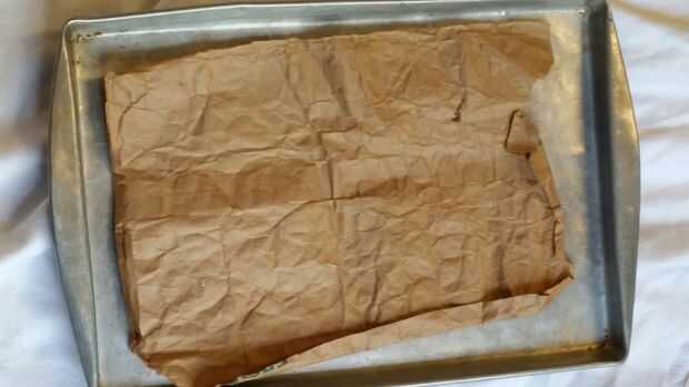 Ahora coge su bolsa de papel y ponerlo en la bandeja para hornear. Ponga que su Shrinky Dinks en él áspero lado abajo.