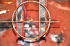 3. Después de organizar las piezas, antorcha-soldar el lado izquierdo del rayo a la parte superior del bucle de la rueda. Sin los bancos la pieza caliente, suelde el lado derecho del rayo en la parte inferior del bucle de la rueda.