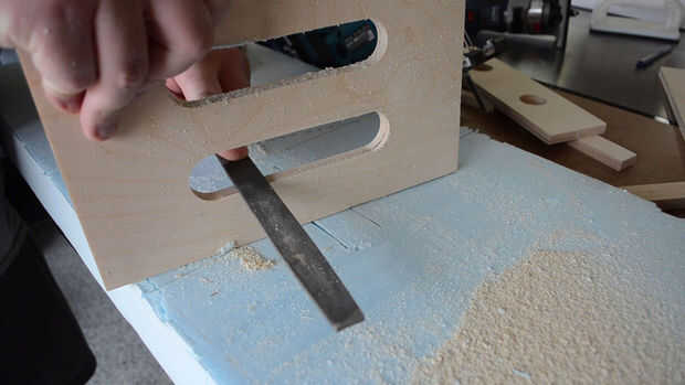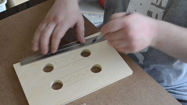 Marcar lugares para perforar los agujeros para crear los mangos - la caja de 8" de alto tiene cuatro agujeros en cada lado - en mi caso he utilizado una broca de 1 1/4" forstner, pero cualquier tamaño entre 3/4" y 1 1/2" debe hacer bien - dibujar líneas que conectan los agujeros y cortar con una sierra de contornear o lo usé , una sierra de calar - limpiar los cortes con un archivo o papel de lija y ronda sobre las áreas de asas con un 1/4 redonda sobre bits y un router - el uso de un router en este paso es opcional pero hacen las asas super cómodas para sostener - si no tienes un lijado a mano router puede alisar hacia fuera bastante bien, así