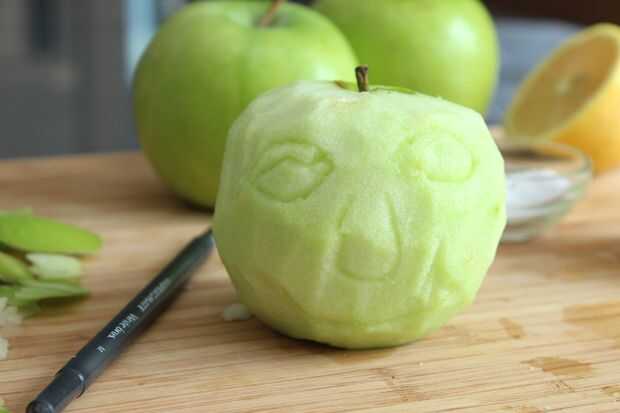 He encontrado que es mejor pelarlas primero y luego cavar a talla. Puede utilizar la punta de un bolígrafo o un lápiz para hacer sangrías en las manzanas para ayudar a guiarlo.