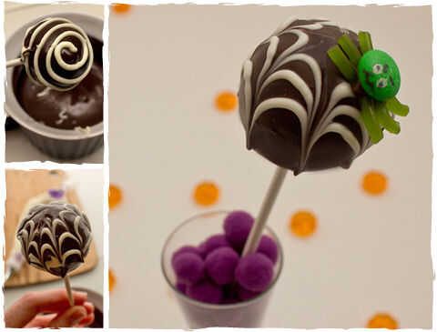 5. después de que su web es completa, mientras que el chocolate está todavía húmedo, añada una araña o dos a lo pop cake.