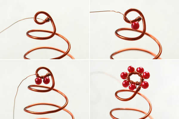 2 º, deslice una tira de perlas de vidrio de 4mm en el alambre de cobre, luego seguir envolver el alambre de cobre alrededor del cable de aluminio varias vueltas;