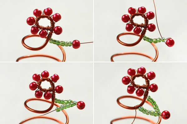 4 Deslice seis rocallas en el hilo de cobre, añadir una gota de perla cristal 4mm nuevo, pasan por detrás del alambre de cobre hasta el último grano de la semilla, apretar los cables, luego añadir cinco granos de la semilla otra vez y continuar envolver el alambre de cobre alrededor de alambre de aluminio;