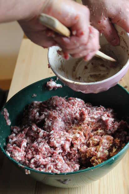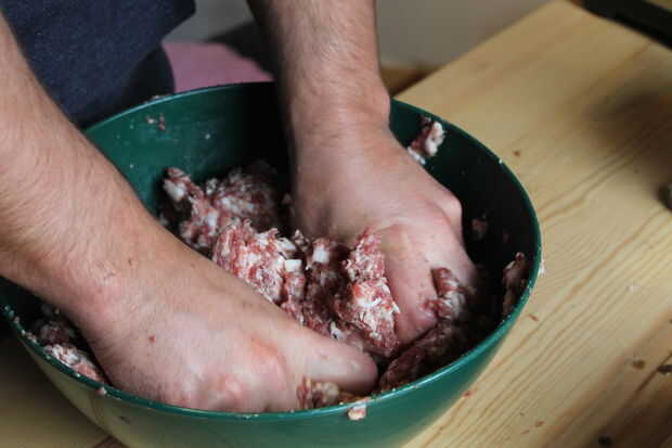 Antes de rellenar las salchichas necesita mezclar bien las especias y carne molida. Si sus materiales son a la temperatura adecuada debe ser bastante incómodo en sus manos - algunas personas son poco hielo de agua en la mezcla para mantener todo frío.