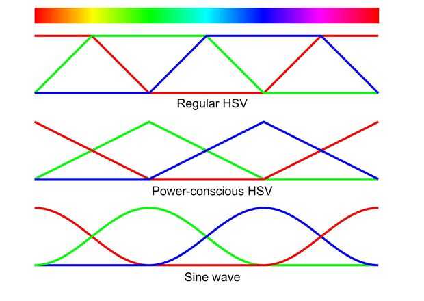 Ver la imagen con gráfico VHS normal. El modelo fue hecho para contener todos los colores posibles, considera amarillo (HSV = 60, 100, 100) que el rojo y verde del modelo RGB al máximo (255, 255, 0). Con RGB LED significa que diodos rojos y verdes son completamente. Lo que significa que cada color compuesto (amarillo, cyan, magenta) consume dos veces más corriente de base uno (rojo, verde, azul). No es bueno, especialmente si usted está tratando con largas tiras de LED o una matriz de LEDs RGB alimentado por USB. El segundo gráfico ('energía consciente HSV') se ve mejor, pero no es el puro color de HSV y más fácilmente se implementa con modelo RGB.