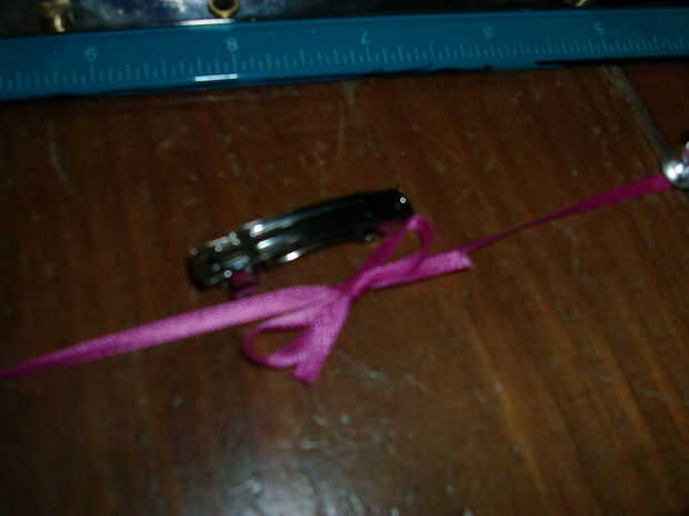 No podemos poner un clip en él porque es tan pequeño. Así que atarlo en tu pelo con el pedazo largo de cinta atado en medio de ella.