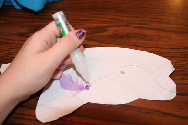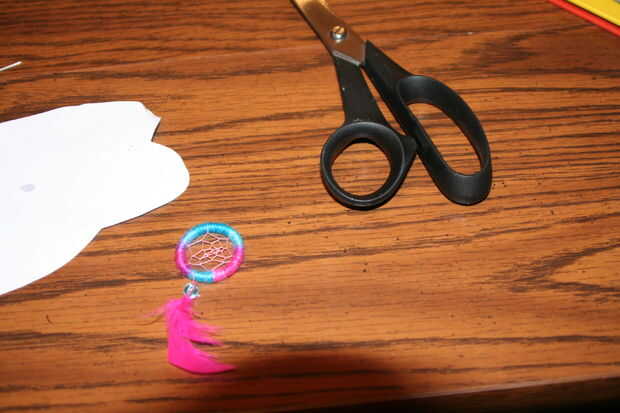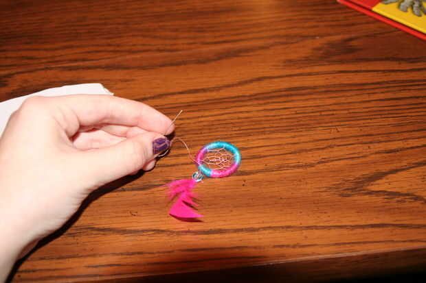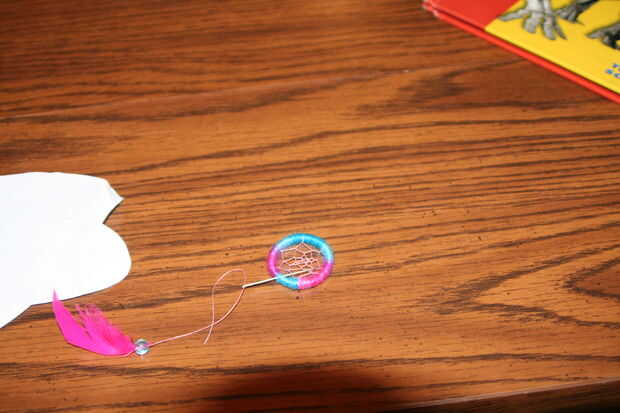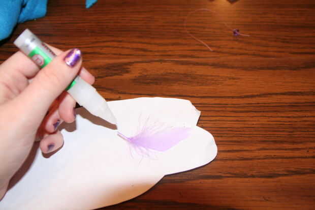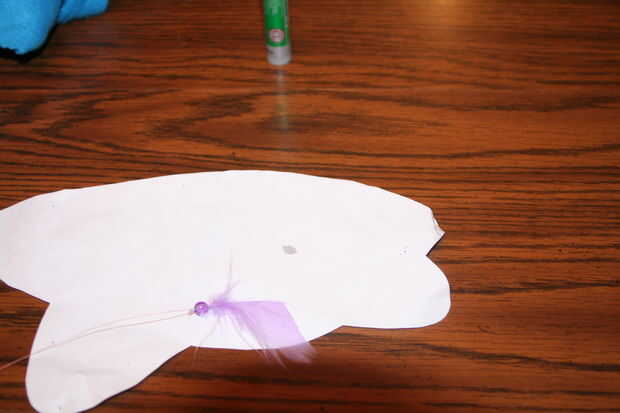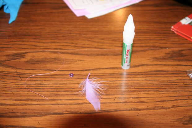 Empecé por cortar longitudes de hilo que son dos veces más tiempo que quería colgar. Esto fue entonces tenía extras para atar nudos y tal. Entonces tomé un grano (el agujero debe ser lo suficientemente amplia como para su pluma caber dentro) y deslizar el hilo a través de él, dejando aproximadamente una pulgada a un lado y 5 por el otro. A continuación cubrí el tallo de la pluma con pegamento, asegurándose de que tenía algo debajo para no arruinar a la mesa. Antes el pegamento pegajoso (tiene unos 5 segundos), he insertado la pluma por el talón en el lado con el extremo corto de la cadena. Asegúrese de que no deslizar la cuerda hacia fuera! Luego usé el pegamento a cada lado del talón, para estar seguro. Después de probado el pegamento, corte la pulgada extra de hilo en el extremo de la pluma.
