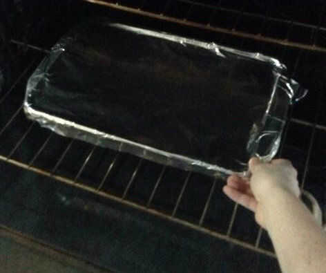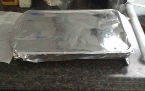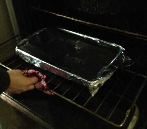 1. una vez que la mezcla de arroz se separa correctamente, cubrir la bandeja de cristal con papel de aluminio.