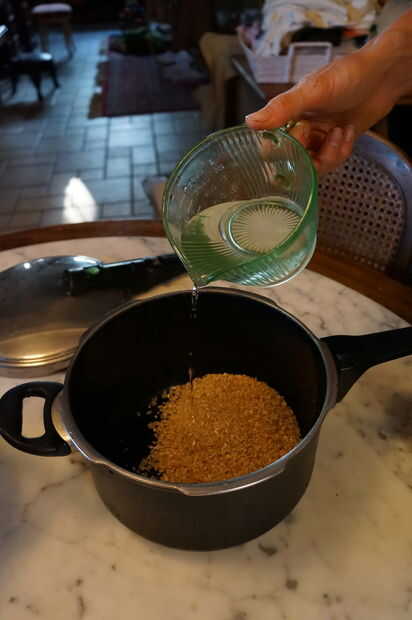 Si utiliza una olla a presión, utilizando la taza medidora "mojado" para evitar derrames, mida dos tazas de agua y añadir a la olla.