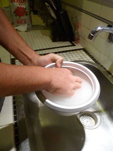 Lavar el arroz por poner agua en la olla y con la mano para revolver el arroz.