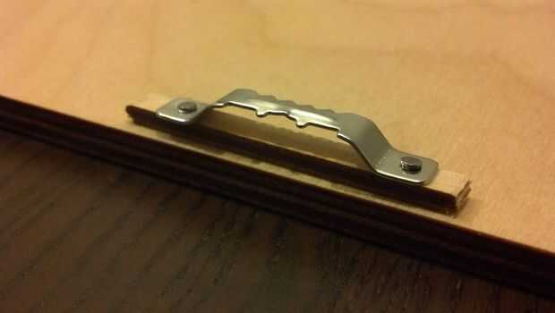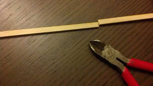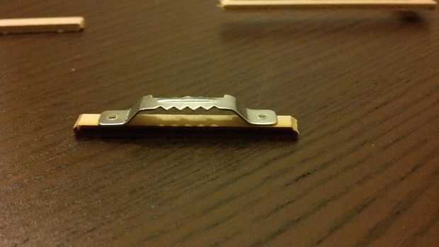 Para los diseños ordené de Ponoko la madera terminó siendo de 3mm de espesor. Esto significó que los clavos que vinieron con mi diente perchas acabaría sobresale un poco la parte delantera. Para solucionar esto simplemente cortar un pedazo de chatarra 3mm aproximadamente al tamaño de los ganchos de diente de sierra y entonces clavó en su lugar. Cualquier cortador de alambre debe ser capaces de hacer decentemente limpio corte en la madera contrachapada de 3mm espesor.