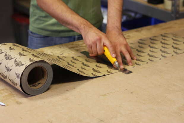 Cortamos un pedazo de cinta de agarre en 20" largo para aplicar nuestra imagen a. Esto va a terminar en el centro de la cubierta y es una agradable pieza breve para trabajar con.