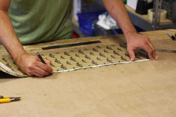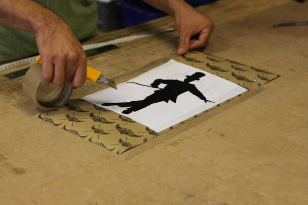 Después de grabar nuestra imagen a la parte posterior (papel) de la cinta de agarre, empezamos a cortar las zonas que queremos mostrar a través de la madera.