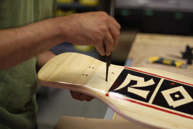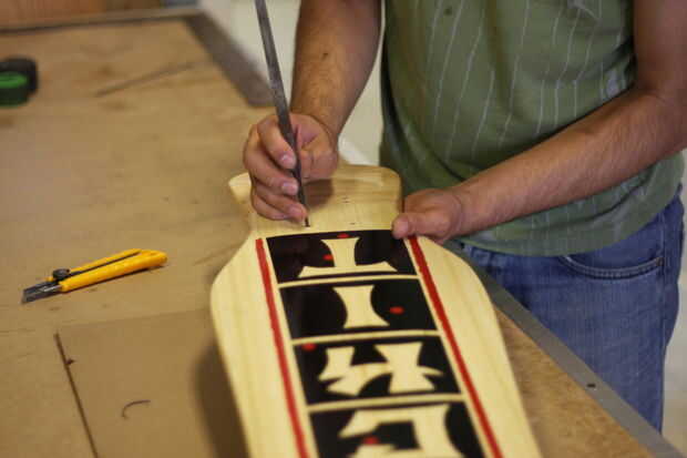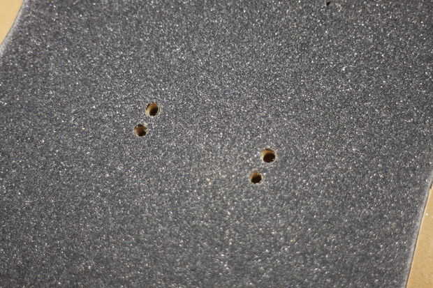 Después de que la superficie de la cubierta ha sido cubierta por la cinta de agarre, probablemente necesitará perfore los agujeros para los pernos de su carro. La forma más sencilla de hacerlo es meter un agujero piloto a través de la empuñadura de la parte inferior de la cubierta. Esto le permitirá ver fácilmente donde los agujeros del carro son de la parte superior de la Junta y se pueden utilizar un archivo, cuchillo, avellanadora o el camión tornillos para quitar el resto del material.