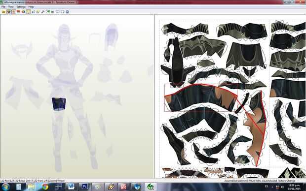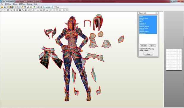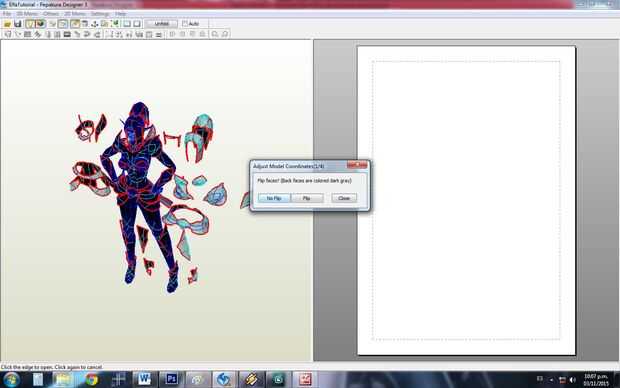 Primero tenemos que abrir el *. El archivo OBJ, Pepakura Designer empezar pizca de trabajo una barra verde y pop este menú imagen 1, el diseño debe ser a veces del tirón, la parte negra es la posición correcta sin texturas. la parte gris es el papel, en este caso para un trabajo más detallado que necesitamos de esta manera porque no queremos doble cara vista piezas con papel blanco