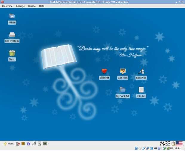 La máquina Virtual contiene el sistema operativo de Linux Debian 7 con el básico entorno de escritorio Xfce. Está preconfigurado para hacer libro haciendo arte de plegamiento fácil. Tiene sólo el software necesario en el mismo: un navegador web, un editor de texto, un programa de gráficos simples y la escritura, que se puede iniciar directamente desde el escritorio. Tienes que iniciar sesión como el usuario 'bookartist' con la contraseña 'prueba '. Si necesita instalar software adicional o desea crear carpetas compartidas con su propio sistema operativo, necesita la contraseña de root, que es también 'prueba'.