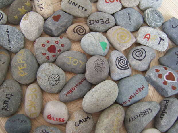 Originalmente iba a plantilla letras del alfabeto y mini laberintos sobre guijarros, pero pronto quedó claro que sería demasiado difícil. Considera el sellado de las rocas, pero finalmente decidió sólo utilizar plumas. También abandonó la idea de usar letras y decidió utilizar palabras (y símbolos) que (yo pensaba son) significativa. Mi lista incluye:
