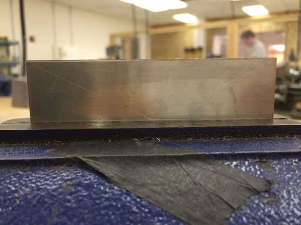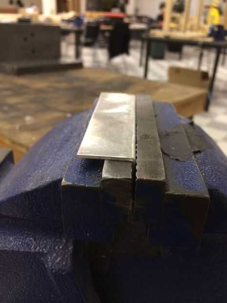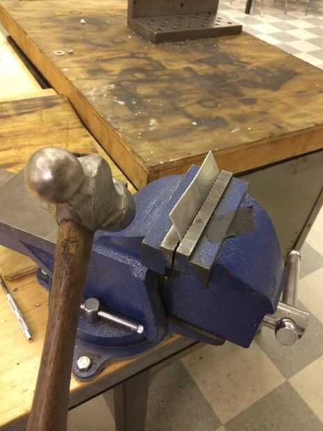 Bueno ahora línea de ese nivel de la línea media con el borde de la mordaza. Luego lo martillo encima, golpeando el borde superior del metal al principio para conseguir comenzó, pero centrándose entonces en dónde está el pliegue. No quieren doblar la parte superior demasiado lejos y entonces tienen un mango con forma extraña.