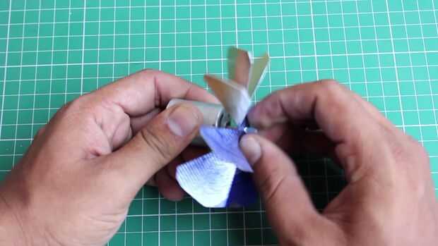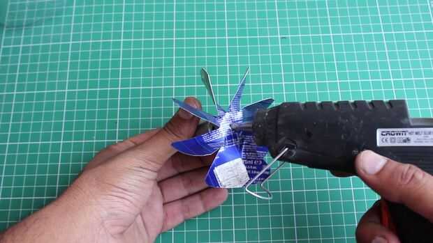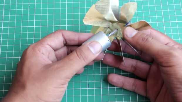 2 cortar la porción sobrante de relleno y luego tomar el ventilador preparado anteriormente y fijar para el relleno colocar la porción de relleno en el orificio del ventilador.
