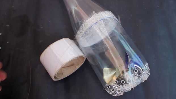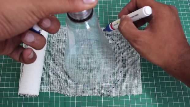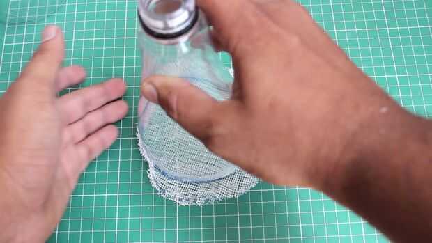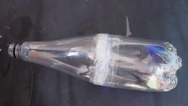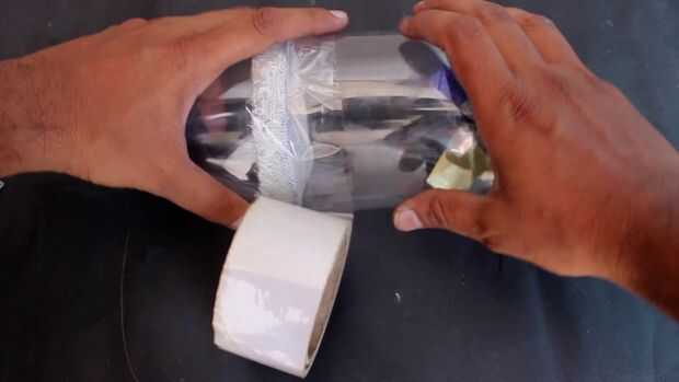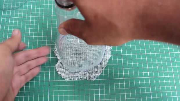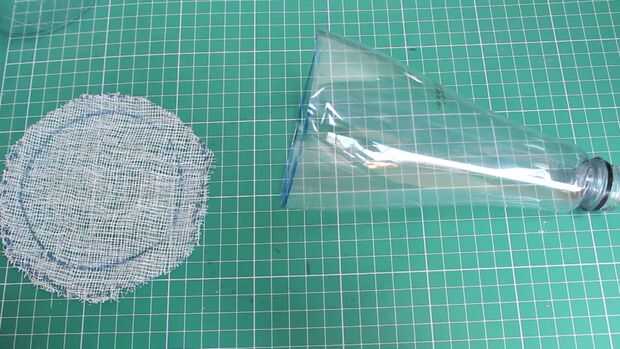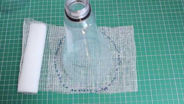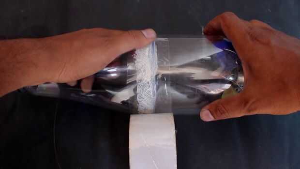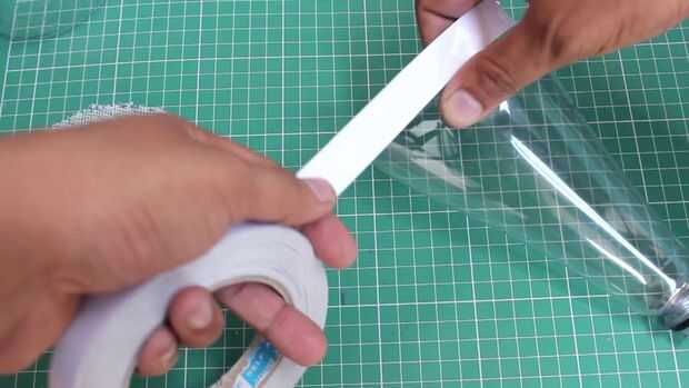 Tome el paño de primeros auxilios y coloque la parte superior de la botella de plástico y lugar en el paño de primeros auxilios y traza un poco más de botella y el uso de cinta de doble cara arreglarlo a la botella y fijan las dos partes de la botella usando una cinta.