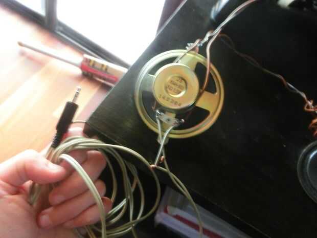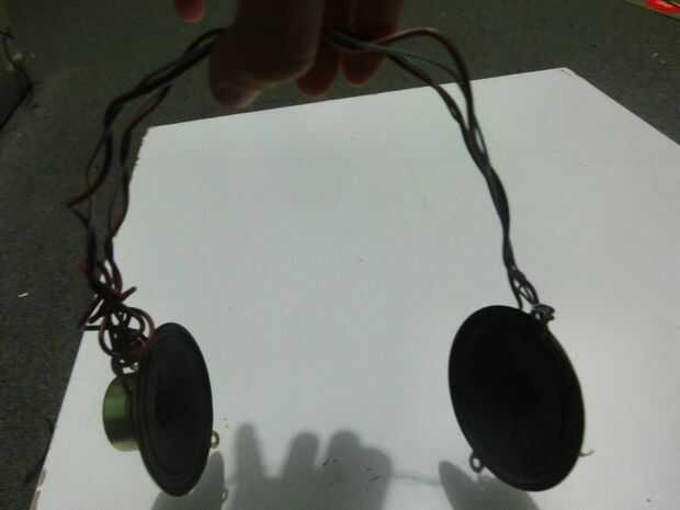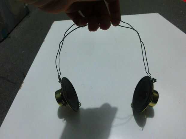 Conecte un cable para altavoz 1 (cualquier terminal) y viento el cable alrededor del soporte de altavoz metálico a altavoz 2 y desde allí usted necesita para cortar el cable para que cuando se la tira, será capaz de conectar al altavoz 2. Ahora hacer lo mismo con el otro terminal altavoz 1 y 2 pero esta vez lo enrolle alrededor de la otra mitad del soporte del auricular de metal. Esto hace que se pueden separar los dos lados del soporte del altavoz metal para hacerla caber en tu cabeza más fácilmente, hace más cómodo, deja los altavoces de rebotando tanto y deja los auriculares deslice su cabeza cuando mira hacia abajo. Asegure el (largo) alambre a los dos terminales de altavoz de 1 o 2 y ya listo. Te recomiendo usar una sudadera mientras esta usando porque los auriculares siente un poco extraños contra los oídos y el soporte de altavoz metálico siente un poco raro e irritante si lo mantienes en el mismo lugar en la cabeza por un tiempo muy largo. A continuación es un video de ella trabajando en el equipo.