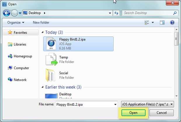 Desplácese a la ubicación en su PC que usted copia de pájaros Flappy, seleccione el archivo IPA de pájaros Flappy y haga clic en Aceptar.