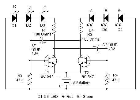 Trabaja en el principio de carga y descarga de los condensadores C1 y C2. Corriente desde el positivo de la batería fluye a través de la primera serie de LEDs D1-D3 al colector del Transistor de1 a través del resistor R1. Resistencia R1 limita la corriente a través de los LEDs para protegerlos. La corriente por R1 carga del condensador C2. Luego descarga a través de la base de T2 y el resistor R4. Esto da la corriente de base a T2 y se lleva a cabo. Como resultado de segundo juego de luces LEDs D4-D6 como la corriente fluye a través de T1. C2 condensador otra vez cargos y el ciclo se repite.