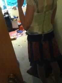 Lo primero que hice fue hacer un vestido. Empecé con encontrar un bustier que encajan bastante bien en una tienda por $4 y ajuste a mi cuerpo. Luego lo adornado con trozos de encaje antiguo que tenía en mis tiendas de tela.