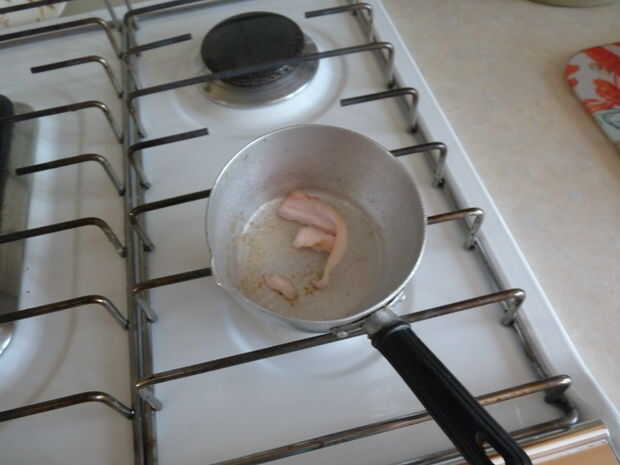 Seleccionar algunos tocino graso agradable y cortar toda la grasa. Que la grasa de tocino en una sartén pequeña con un trozo pequeño de tocino 'carne' en el pan así. Ahora calor el tocino con un poco de aceite hasta que se doren, luego Vierta el aceite en el recipiente con el bálsamo de labio base lo se.