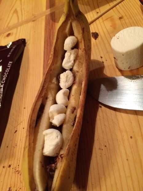 Compilar el chocolate y los malvaviscos en el plátano. Asegúrese de que no está saliendo de la abertura. (En la foto, el chocolate es bajo las melcochas).